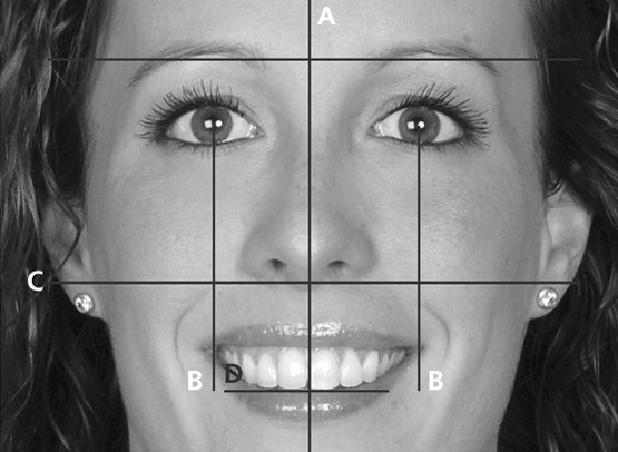 Das Gesicht wird vertikal durch die Mittellinie in zwei Hälften geteilt. Idealerweise verläuft diese durch die Nasenspitze, die Mitte der Lippen und zwischen den mittleren Schneidezähnen. Die Pupillen sollten vertikal mit den Mundwinkeln auf einer Linie liegen.